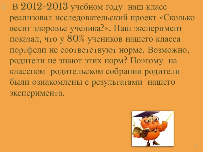 Слайд 17 В 2012-2013 учебном году наш класс реализовал исследовательский проект «Сколько