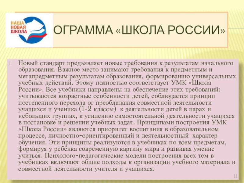 Важное место занимают требования к предметным и метапредметным результатам образования, формированию универсальных учебных действий. Этому полностью соответствует УМК «Школа России». Все учебники направлены на обеспечение этих требований: учитываются возрастные особенности детей, соблюдается принцип постепенного перехода от преобладания совместной деятельности учащихся и ученика (1-2 классы) к деятельности детей в парах и небольших группах, к усилению самостоятельной деятельности учащихся в постановке и решении учебных задач. Принципами построения УМК «Школа России» являются приоритет воспитания в образовательном процессе, личностно-ориентированный и деятельностный характер обучения. Эти принципы реализуются в учебниках по всем предметам, формируя у ребёнка современную картину мира и развивая умение учиться. Психолого-педагогические модели построения всех тем в учебниках включают общие подходы к организации учебного материала и совместной деятельности учителя и учащихся.