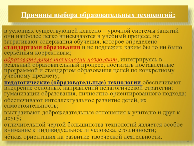 педагогические (образовательные) технологии обеспечивают внедрение основных направлений педагогической стратегии: гуманизации образования, личностно-ориентированного подхода;