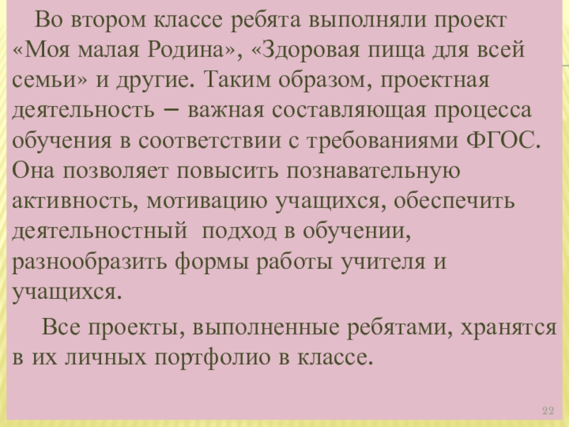 Слайд 22 Во втором классе ребята выполняли проект «Моя малая Родина»,