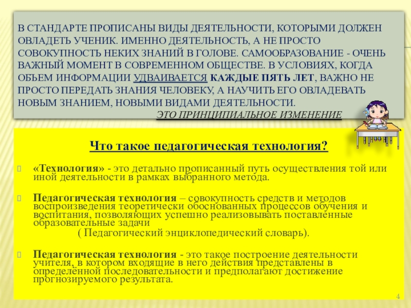 Педагогическая технология - это такое построение деятельности учителя, в котором входящие в него действия представлены в определённой последовательности и предполагают достижение прогнозируемого результата.