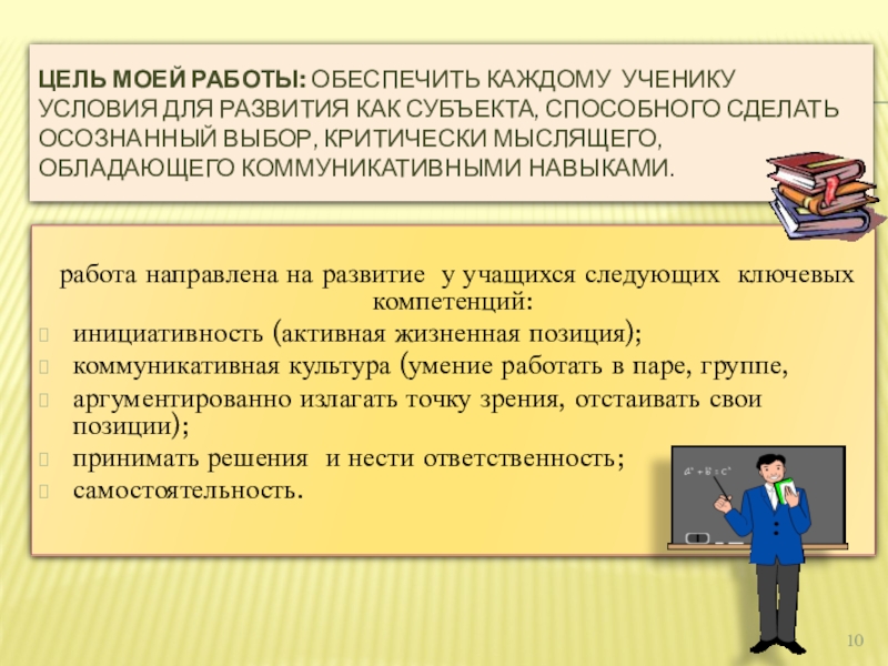 Слайд 10Цель МОЕЙ Работы: обеспечить каждому ученику условия для развития как субъекта,