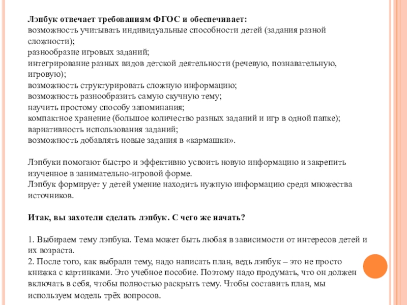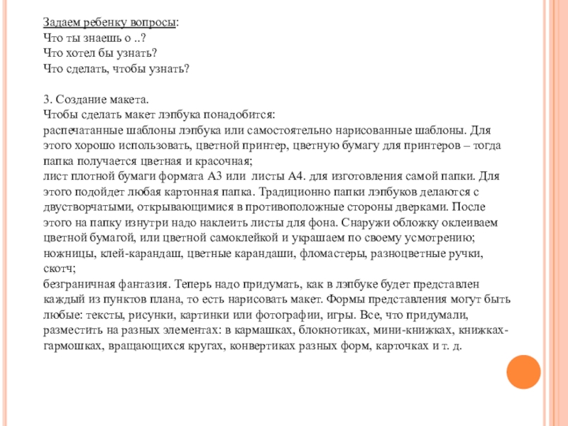 2. После того, как выбрали тему, надо написать план, ведь лэпбук – это не просто книжка с картинками. Это учебное пособие. Поэтому надо продумать, что он должен включать в себя, чтобы полностью раскрыть тему. Чтобы составить план, мы используем модель трёх вопросов.