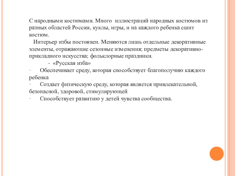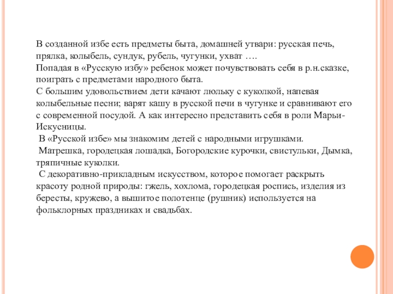 Попадая в «Русскую избу» ребенок может почувствовать себя в р.н.сказке, поиграть с предметами народного быта.