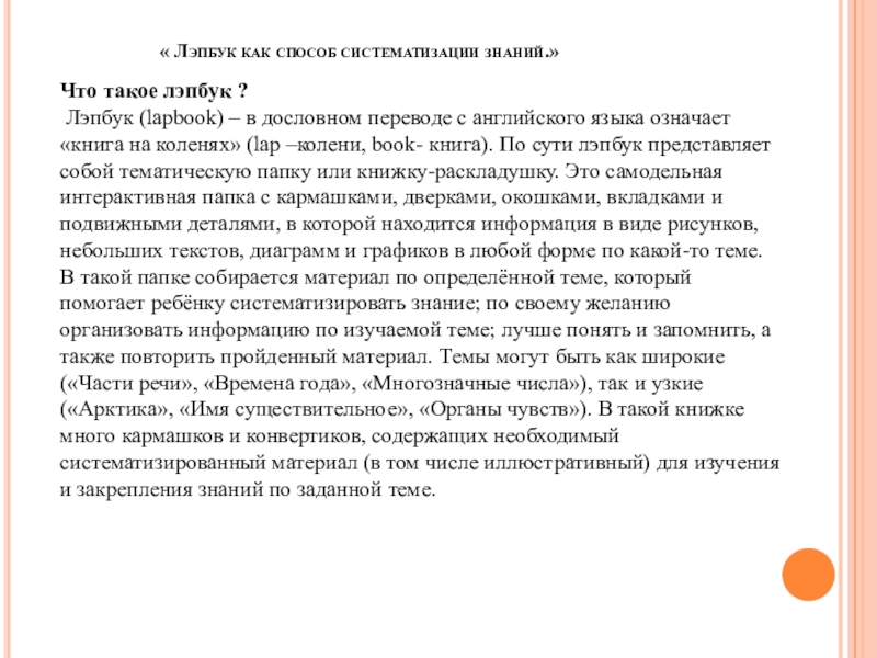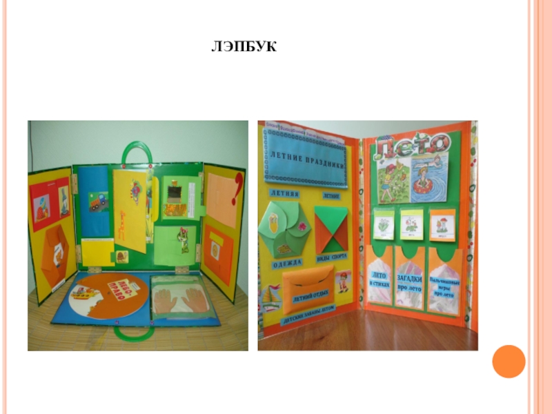Лэпбук (lapbook) – в дословном переводе с английского языка означает «книга на коленях» (lap –колени, book- книга). По сути лэпбук представляет собой тематическую папку или книжку-раскладушку. Это самодельная интерактивная папка с кармашками, дверками, окошками, вкладками и подвижными деталями, в которой находится информация в виде рисунков, небольших текстов, диаграмм и графиков в любой форме по какой-то теме.