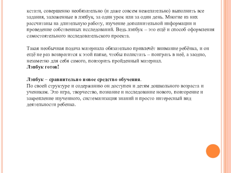 в лэпбук, за один урок или за один день. Многие из них рассчитаны на длительную работу, изучение дополнительной информации и проведение собственных исследований. Ведь лэпбук – это ещё и способ оформления самостоятельного исследовательского проекта.