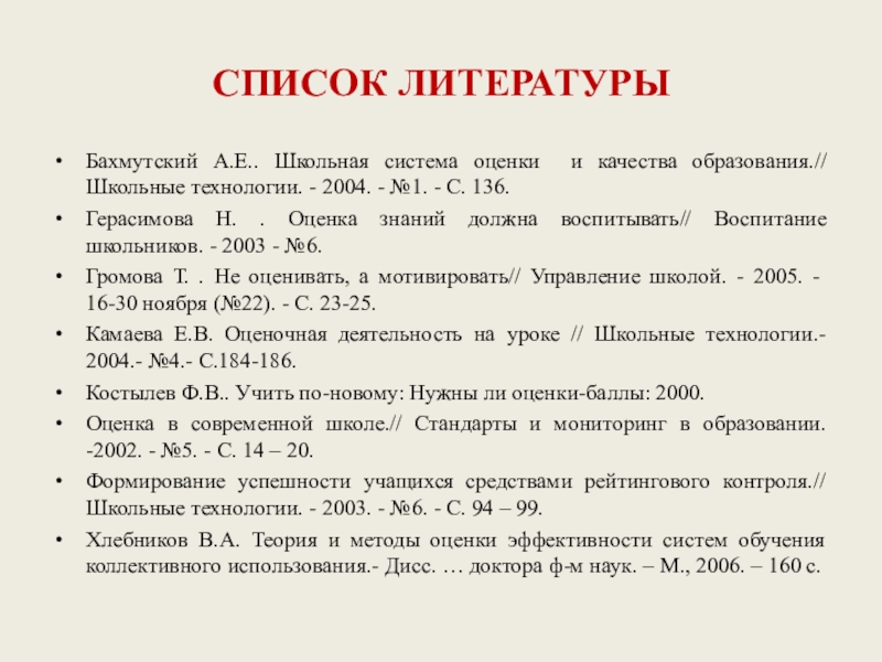 Оценка в современной школе.// Стандарты и мониторинг в образовании. -2002. - №5. - С. 14 – 20.
