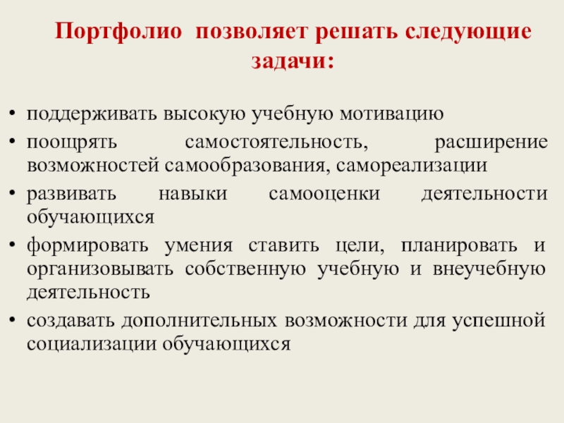 Слайд 43Портфолио позволяет решать следующие задачи: