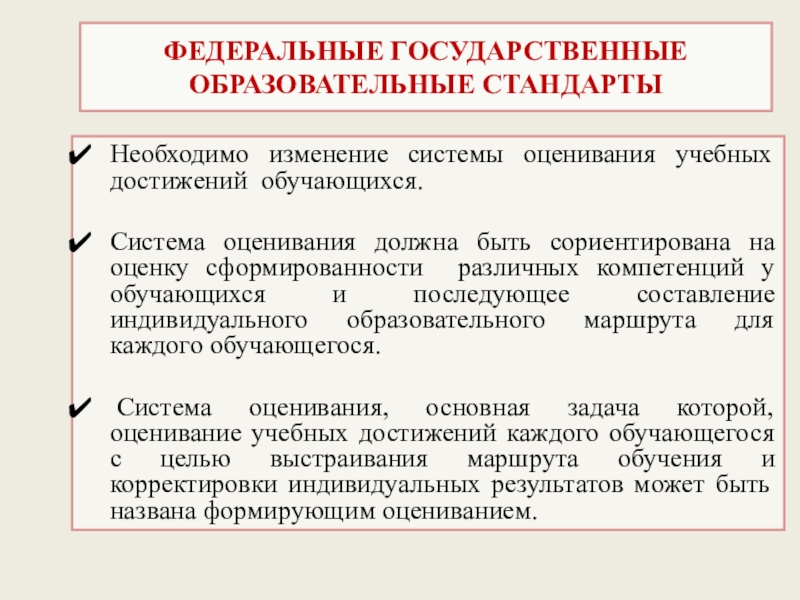 Система оценивания, основная задача которой, оценивание учебных достижений каждого обучающегося с целью выстраивания маршрута обучения и корректировки индивидуальных результатов может быть названа формирующим оцениванием.
