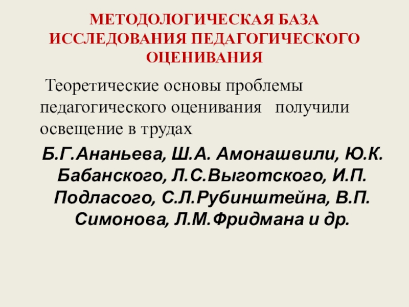 Слайд 2МЕТОДОЛОГИЧЕСКАЯ БАЗА ИССЛЕДОВАНИЯ ПЕДАГОГИЧЕСКОГО ОЦЕНИВАНИЯ