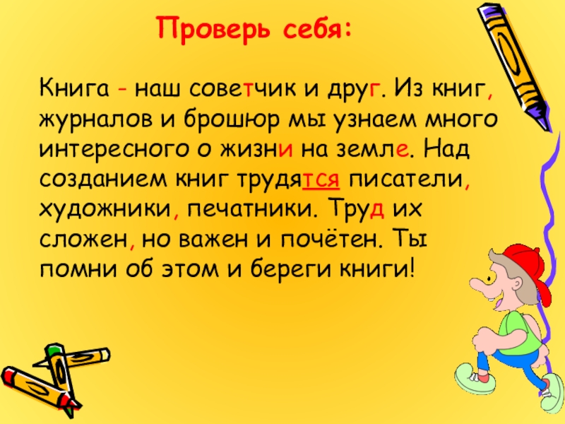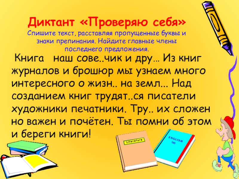 Книга наш сове..чик и дру… Из книг журналов и брошюр мы узнаем много интересного о жизн.. на земл... Над созданием книг трудят..ся писатели художники печатники. Тру.. их сложен но важен и почётен. Ты помни об этом и береги книги!