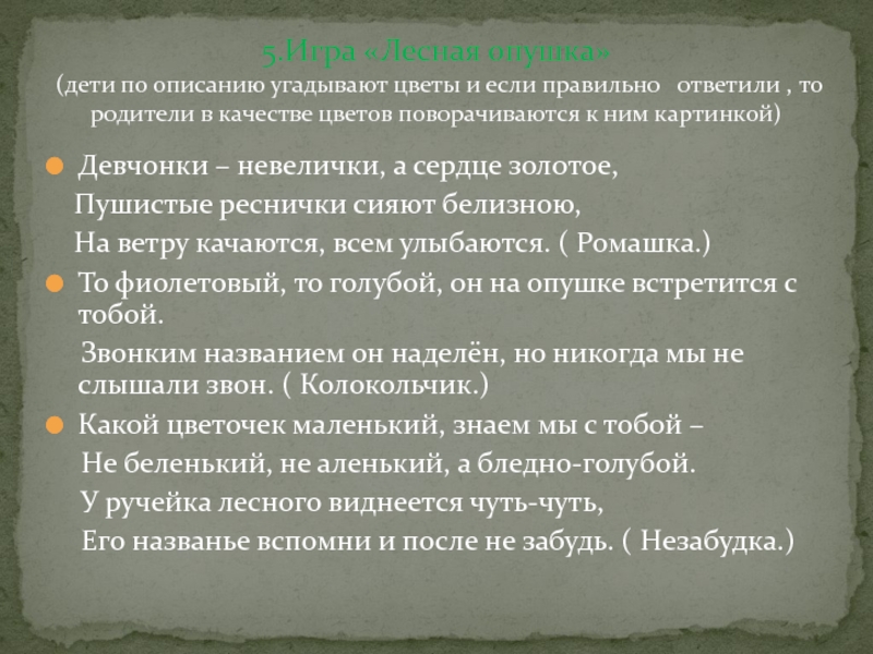 (дети по описанию угадывают цветы и если правильно ответили , то родители в качестве цветов поворачиваются к ним картинкой)