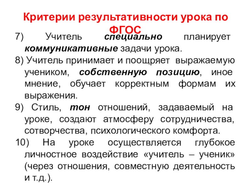 9) Стиль, тон отношений, задаваемый на уроке, создают атмосферу сотрудничества, сотворчества, психологического комфорта.