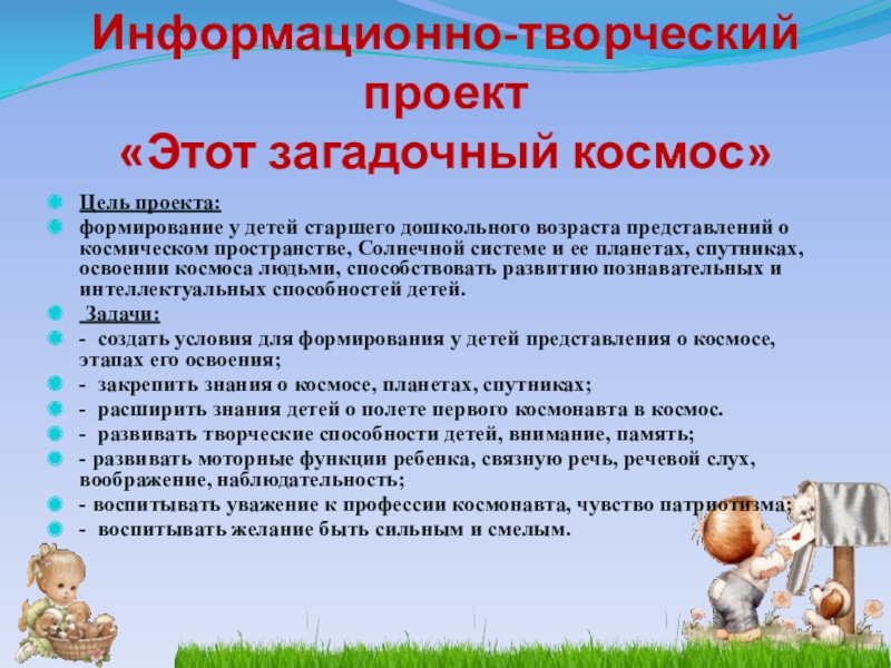 представлений о космическом пространстве, Солнечной системе и ее планетах, спутниках, освоении космоса людьми, способствовать развитию познавательных и интеллектуальных способностей детей.