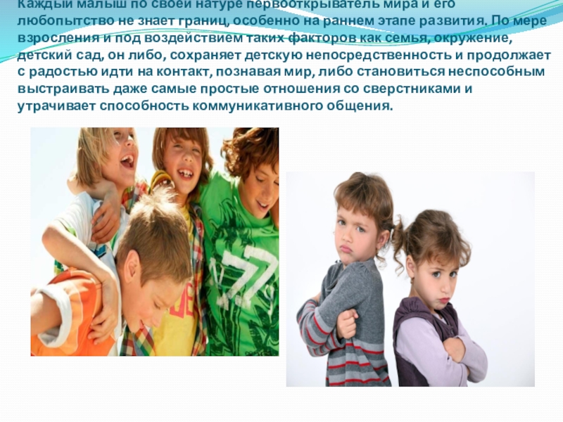 знает границ, особенно на раннем этапе развития. По мере взросления и под воздействием таких факторов как семья, окружение, детский сад, он либо, сохраняет детскую непосредственность и продолжает с радостью идти на контакт, познавая мир, либо становиться неспособным выстраивать даже самые простые отношения со сверстниками и утрачивает способность коммуникативного общения.