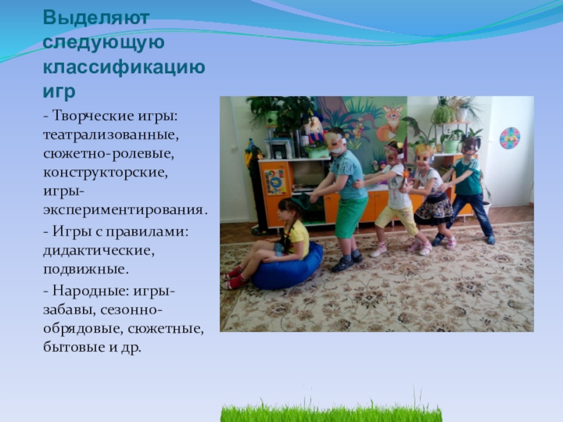 - Народные: игры-забавы, сезонно-обрядовые, сюжетные, бытовые и др.