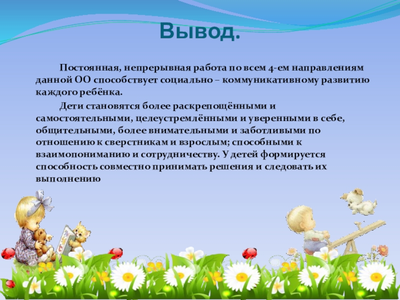 Дети становятся более раскрепощёнными и самостоятельными, целеустремлёнными и уверенными в себе, общительными, более внимательными и заботливыми по отношению к сверстникам и взрослым; способными к взаимопониманию и сотрудничеству. У детей формируется способность совместно принимать решения и следовать их выполнению