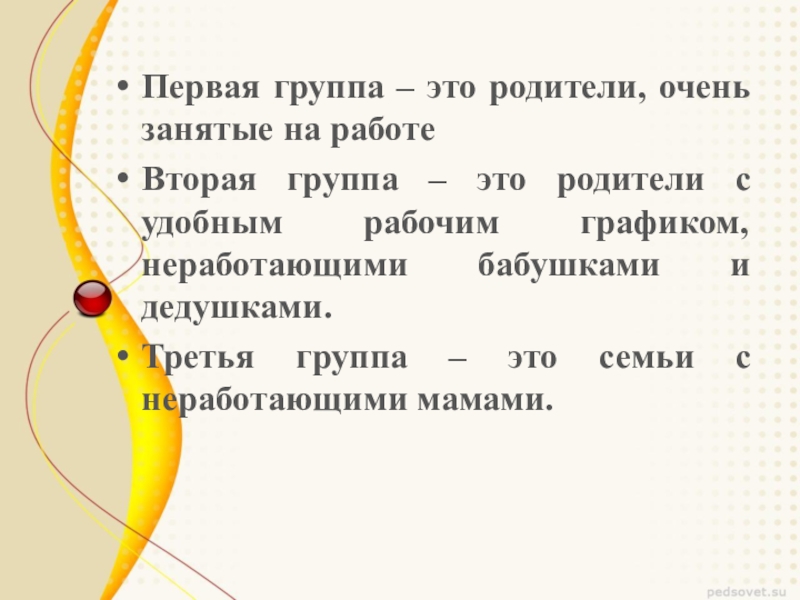 Слайд 4Первая группа – это родители, очень занятые на работе