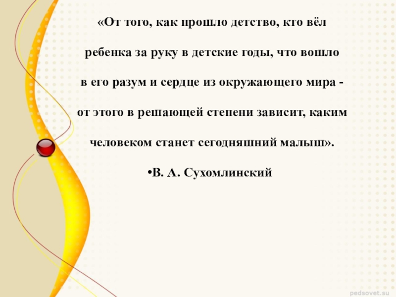 «От того, как прошло детство, кто вёлребенка за руку в детские годы, что вошлов его разум и сердце из окружающего мира -от этого в решающей степени зависит, какимчеловеком станет сегодняшний малыш».В. А. Сухомлинский
