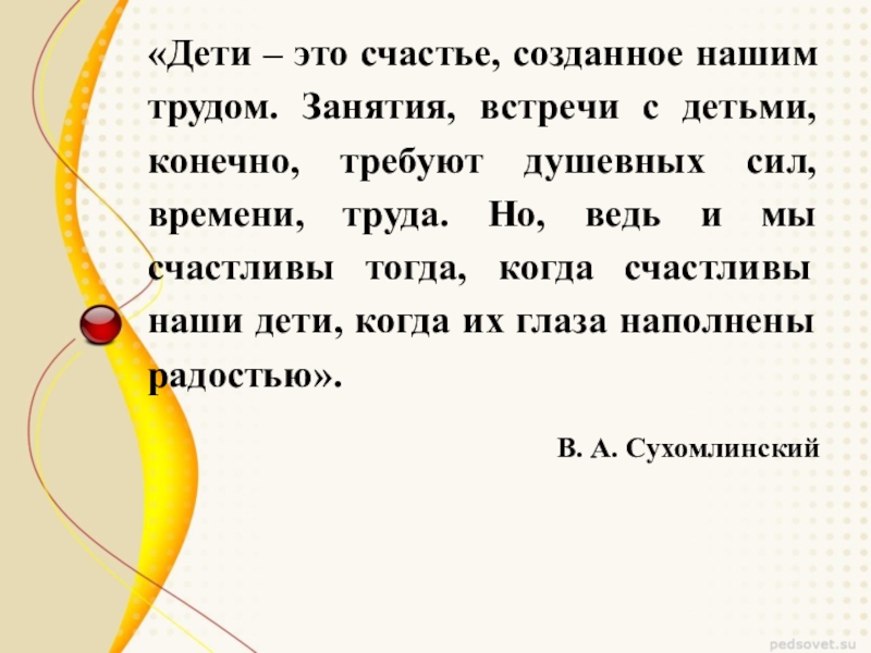 Слайд 9«Дети – это счастье, созданное нашим трудом. Занятия, встречи с детьми,