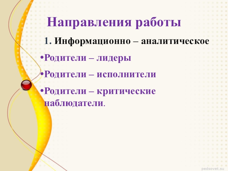 Направления работы 1. Информационно – аналитическоеРодители – лидерыРодители – исполнителиРодители – критические наблюдатели.