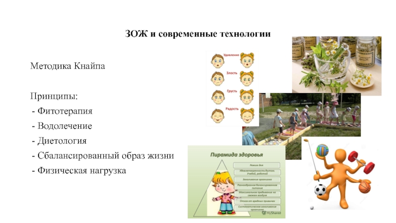 ЗОЖ и современные технологииМетодика КнайпаПринципы:ФитотерапияВодолечениеДиетологияСбалансированный образ жизниФизическая нагрузка