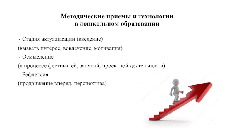Методические приемы и технологии в дошкольном образованииСтадия актуализации (введение)(вызвать интерес, вовлечение, мотивация)Осмысление(в процессе фестивалей, занятий, проектной деятельности)Рефлексия(продвижение вперед, перспектива)