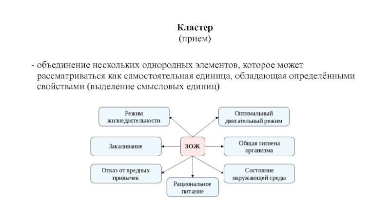 Кластер (прием)объединение нескольких однородных элементов, которое может рассматриваться как самостоятельная единица, обладающая определёнными свойствами (выделение смысловых единиц)