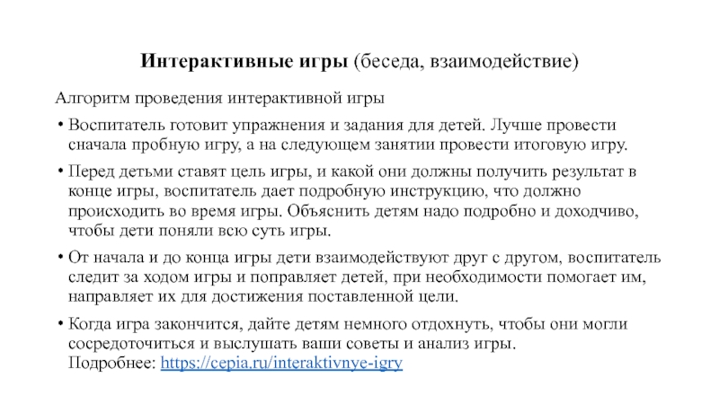 Интерактивные игры (беседа, взаимодействие)Алгоритм проведения интерактивной игрыВоспитатель готовит упражнения и задания для детей. Лучше провести сначала пробную