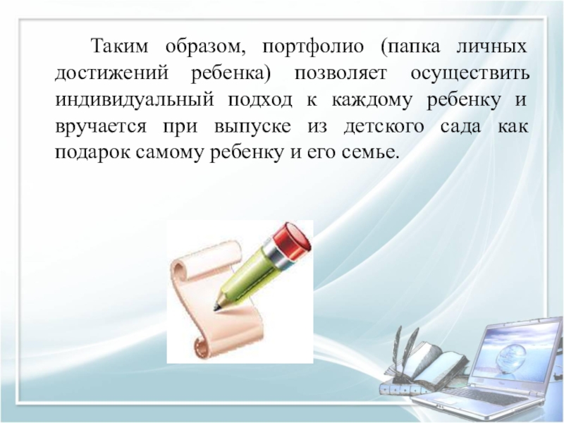 Слайд 25 Таким образом, портфолио (папка личных достижений ребенка) позволяет осуществить индивидуальный подход