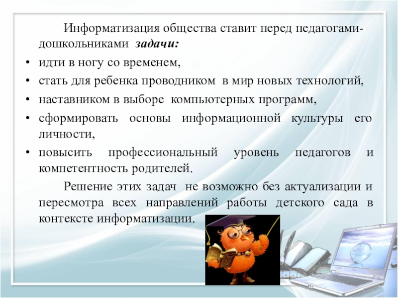 Слайд 7 Информатизация общества ставит перед педагогами-дошкольниками задачи: