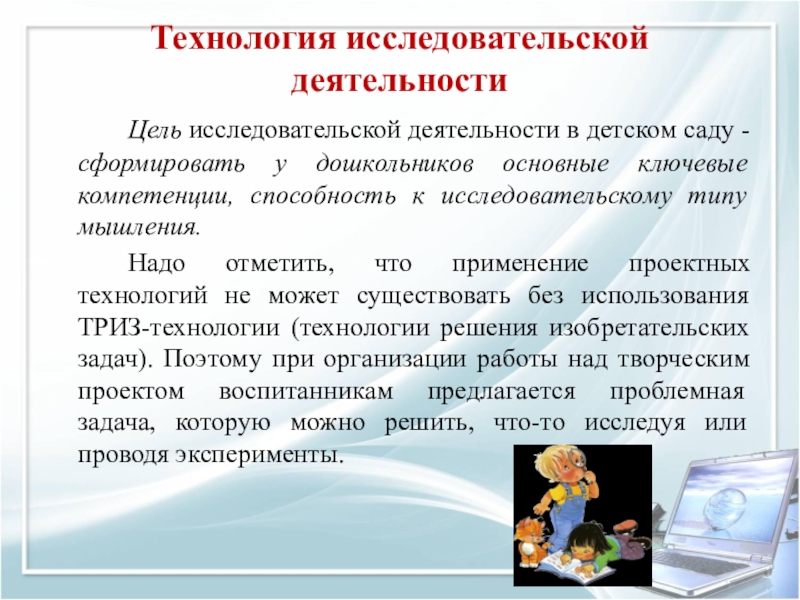 Надо отметить, что применение проектных технологий не может существовать без использования ТРИЗ-технологии (технологии решения изобретательских задач). Поэтому при организации работы над творческим проектом воспитанникам предлагается проблемная задача, которую можно решить, что-то исследуя или проводя эксперименты.
