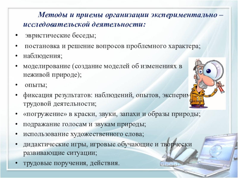 Слайд 3 Методы и приемы организации экспериментально – исследовательской деятельности: