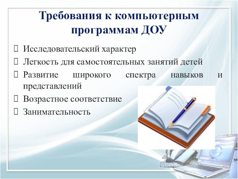 Слайд 8Требования к компьютерным программам ДОУ