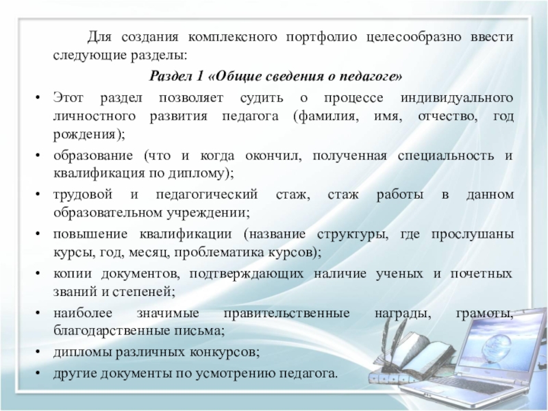 Слайд 28 Для создания комплексного портфолио целесообразно ввести следующие разделы: