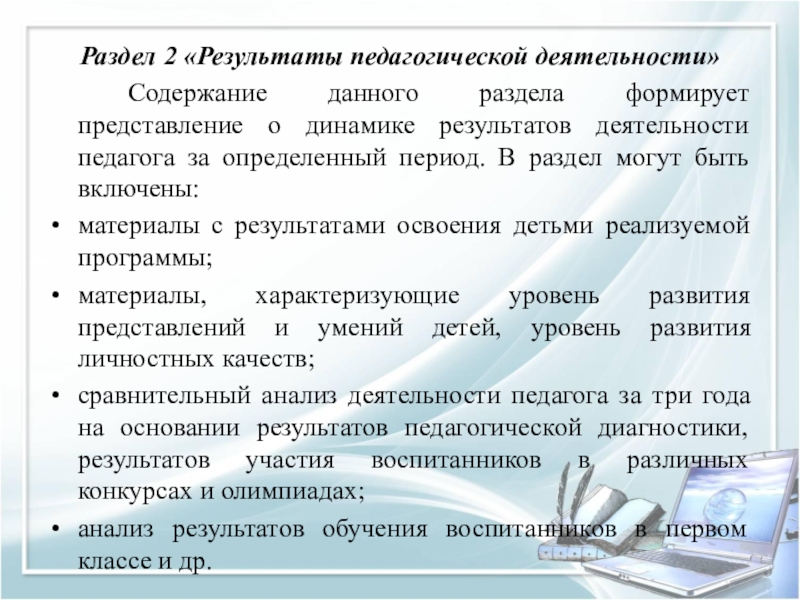 результатов деятельности педагога за определенный период. В раздел могут быть включены:
