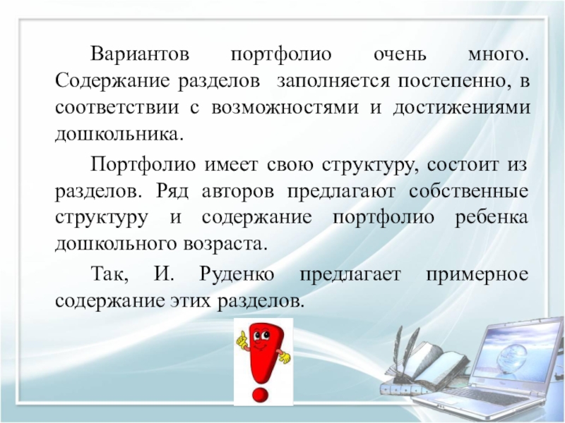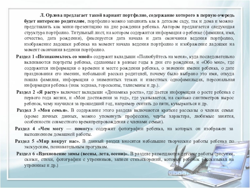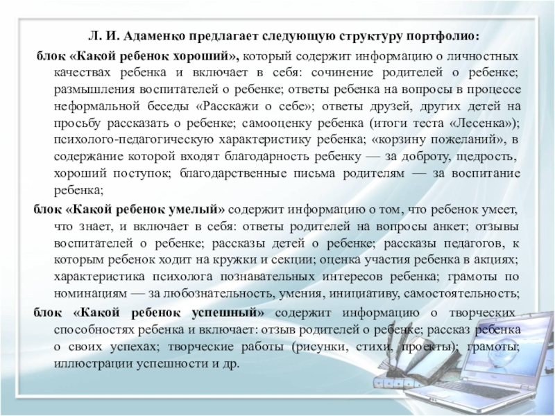 Слайд 24 Л. И. Адаменко предлагает следующую структуру портфолио: