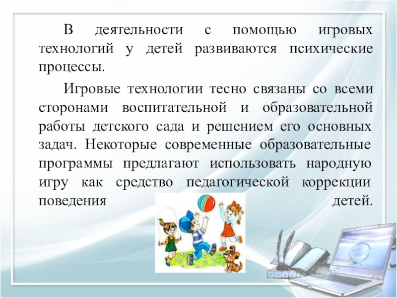 технологии тесно связаны со всеми сторонами воспитательной и образовательной работы детского сада и решением его основных задач. Некоторые современные образовательные программы предлагают использовать народную игру как средство педагогической коррекции поведения детей.
