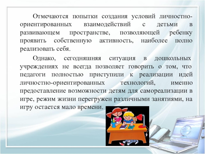 Однако, сегодняшняя ситуация в дошкольных учреждениях не всегда позволяет говорить о том, что педагоги полностью приступили к реализации идей личностно-ориентированных технологий, именно предоставление возможности детям для самореализации в игре, режим жизни перегружен различными занятиями, на игру остается мало времени.