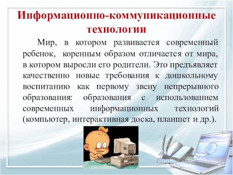 мира, в котором выросли его родители. Это предъявляет качественно новые требования к дошкольному воспитанию как первому звену непрерывного образования: образования с использованием современных информационных технологий (компьютер, интерактивная доска, планшет и др.).