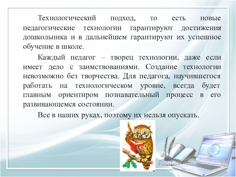 Слайд 18 Технологический подход, т.е. новые педагогические технологии гарантируют достижения дошкольника.