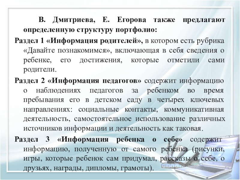 Слайд 23 В. Дмитриева, Е. Егорова также предлагают определенную структуру портфолио: