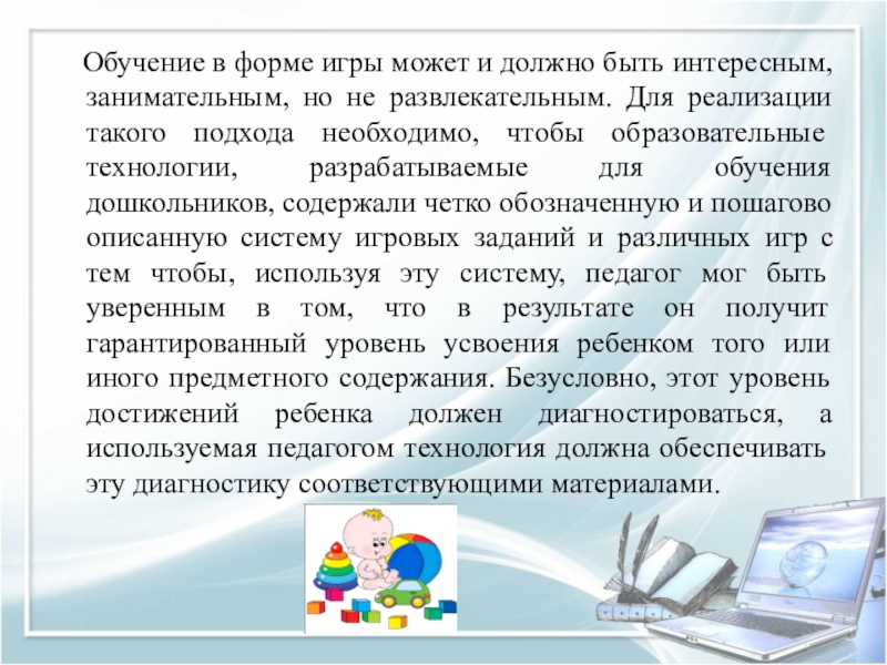 занимательным, но не развлекательным. Для реализации такого подхода необходимо, чтобы образовательные технологии, разрабатываемые для обучения дошкольников, содержали четко обозначенную и пошагово описанную систему игровых заданий и различных игр с тем чтобы, используя эту систему, педагог мог быть уверенным в том, что в результате он получит гарантированный уровень усвоения ребенком того или иного предметного содержания. Безусловно, этот уровень достижений ребенка должен диагностироваться, а используемая педагогом технология должна обеспечивать эту диагностику соответствующими материалами.