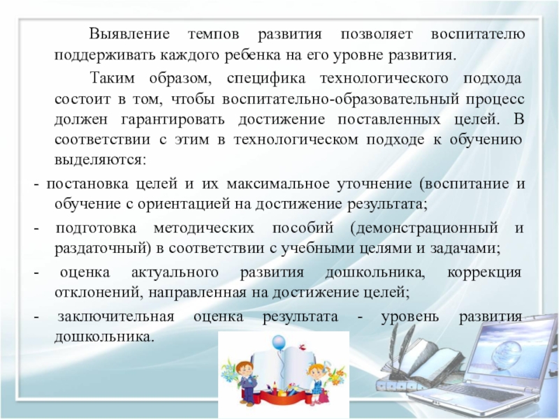 Сущность технологического воспитательно-образовательного процесса конструируется на основе заданных исходных установок: социальный заказ (родители, общество) образовательные ориентиры, цели и содержание образования. Эти исходные установки должны конкретизировать современные подходы к оценке достижений дошкольников, а также создавать условия для индивидуальных и дифференцированных заданий.