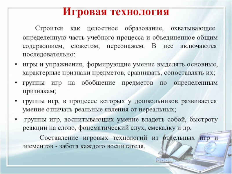 Составление игровых технологий из отдельных игр и элементов - забота каждого воспитателя.
