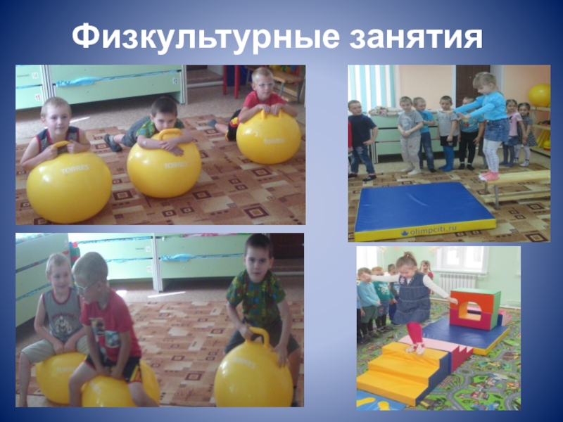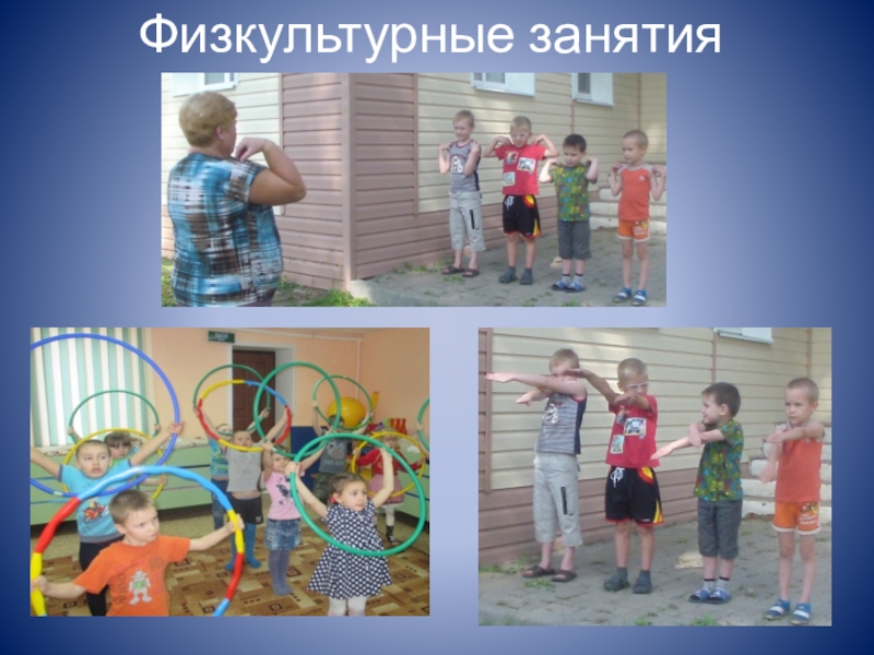 Физкультурные занятия проводятся в хорошо проветренном помещение 2-3 раза в неделю в спортивном зале. Младший возраст- 15-20 мин., средний возраст - 20-25 мин., старший возраст - 25-30 мин. Проводят воспитатели.