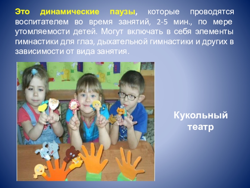 Это динамические паузы, которые проводятся воспитателем во время занятий, 2-5 мин., по мере утомляемости детей. Могут включать в себя элементы гимнастики для глаз, дыхательной гимнастики и других в зависимости от вида занятия.