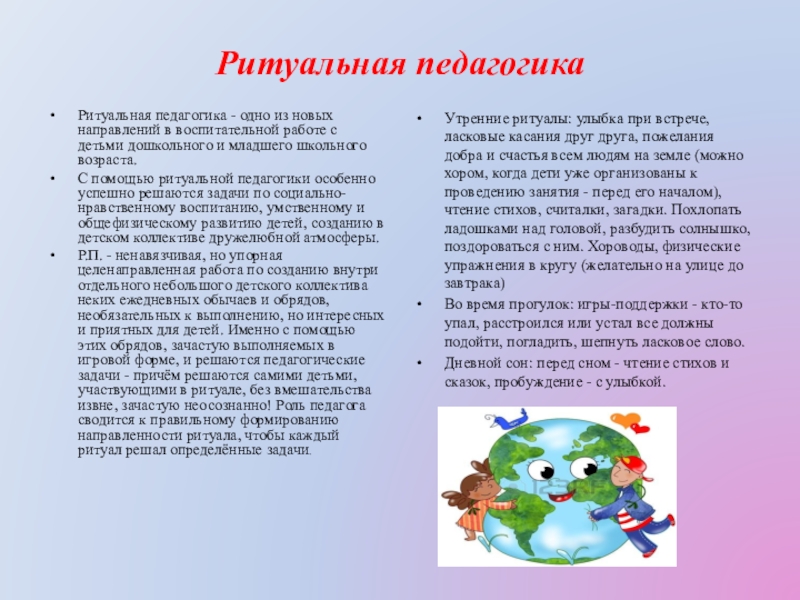 Утренние ритуалы: улыбка при встрече, ласковые касания друг друга, пожелания добра и счастья всем людям на земле (можно хором, когда дети уже организованы к проведению занятия - перед его началом), чтение стихов, считалки, загадки. Похлопать ладошками над головой, разбудить солнышко, поздороваться с ним. Хороводы, физические упражнения в кругу (желательно на улице до завтрака)