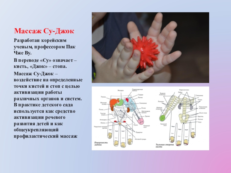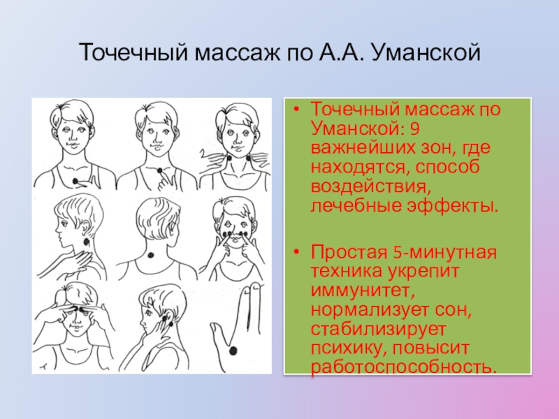 Воздействие на биологически активные точки (БАТ) представляет собой один из методов рефлекторной терапии. Путем нажатия на БАТ вызываются определенные рефлекторные реакции в соответствующих органах и мышцах. Методика точечного массажа отличается относительной простотой проведения, физиологичностью, малой зоной воздействия и возможностью проведения не только для коррекции, но и для профилактики.