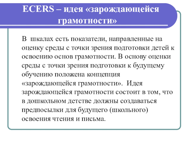 Слайд 15 ECERS – идея «зарождающейся грамотности»